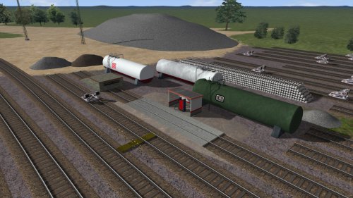 Equipment objects such as filling station for locomotives, gravel piles etc.