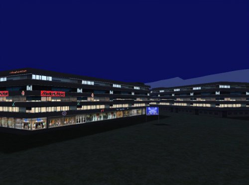 Set of two commercial buildings (a shopping centre and an office building) with a road sign. All objects have day, night and winter textures.