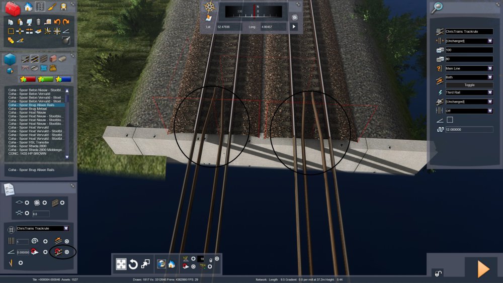 Beste mensen, Ik heb een dringende vraag voor de mensen met verstand van routebouwen in Train Simulator. Ik wil/moet een stuk knippen uit het bestaande spoor om deze vervolgens te vervangen met het spoor waar alleen de rails zichtbaar zijn (Coha - spoor brug Alleen Rails). Maar... Dit lukt mij prima op stukken waar het spoor recht is, dan is het knippen en vervangen een eitje. Vervolgens sluit het allemaal makkelijk aan en is er niks aan de hand. Maar ik heb een probleem met stukken spoor in een 'bocht' (zie screenshots). Ik kan het spoor niet aansluiten aan elkaar. Op geen enkel manier lukt mij dit. Ik vraag me dan ook oprecht af wat ik fout/verkeerd doe. Als ik dit probeer dan sluit het spoor niet precies aan waardoor er een centimeter verschil uitwijkt waardoor de trein ontspoord en er dus een knik in het spoor zit. Dat kunnen wij natuurlijk niet hebben. De kant waar ik het spoor wil 'verlengen' komt geen knik of iets dergelijks, die loopt samen door maar het probleem doemt zich dus aan op het moment ik deze bij de andere kant wil klikken. Dat pakt hij dus niet... Wie weet hoe ik dit probleem moet oplossen? Ik heb zelf geprobeerd het uit te zoeken maar ik kom er niet uit. Help me out ?