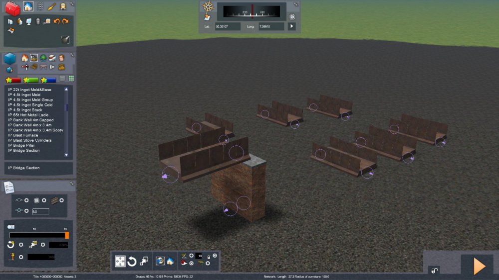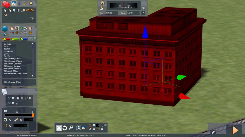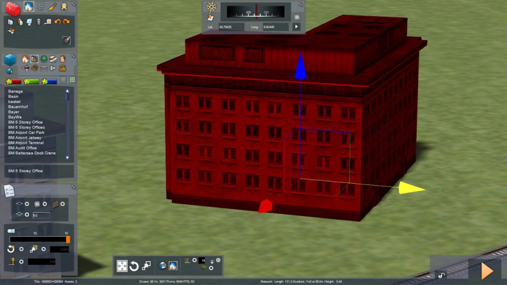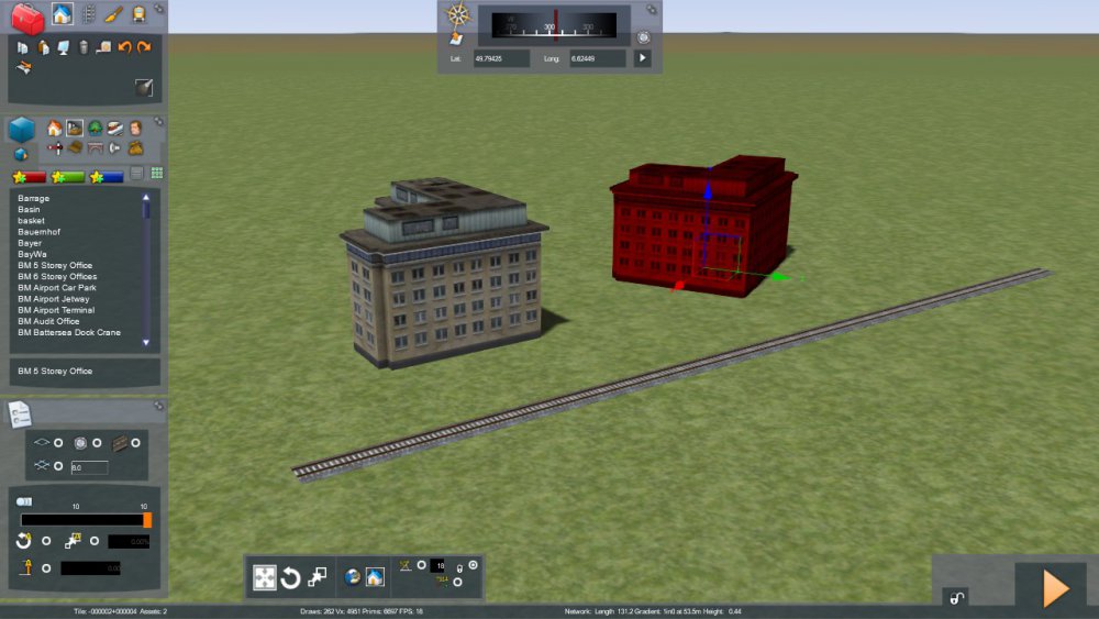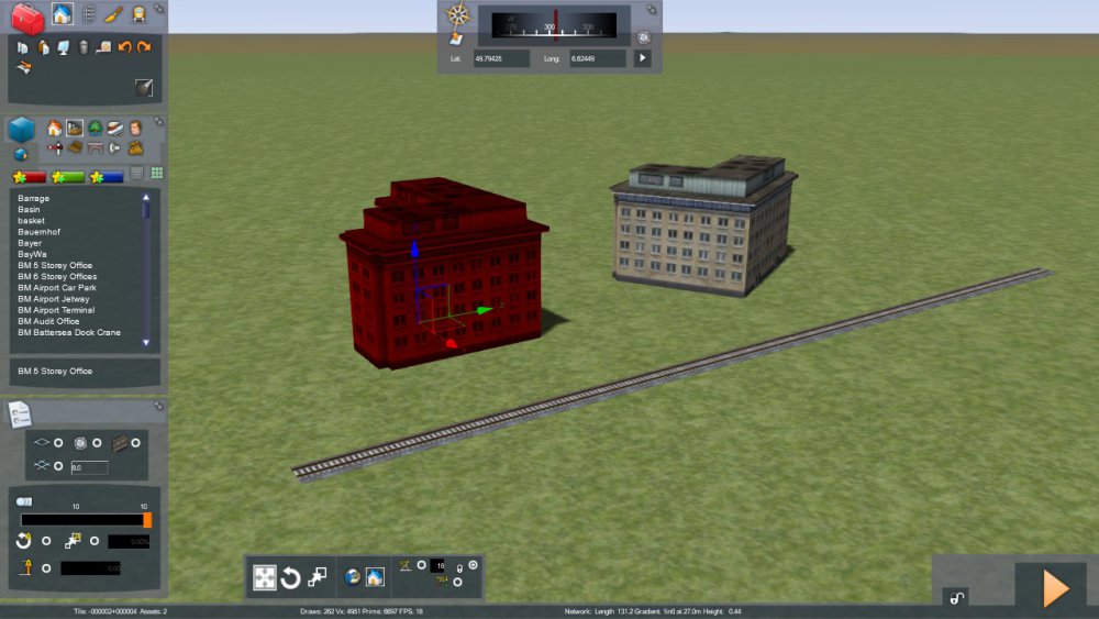 Ik heb weinig ervaring met bouwen van bovenleiding omdat ik nu eenmaal vooral met stoom rij en ook de routes hiervan heb. Het is wel een hele heisa om bovenleiding goed en netjes op zijn plaats te krijgen Maar je kunt ook proberen om de alignment button te gebruiken. Dat is de de icoon in de linker fly-out in de tools sectie bovenin. Het is de enige icoon die op de tweede regel staat onder de rest van de tools. Als je daarop klik dan moet je even kijken op in de bovenleiding en de uitleggers cirkeltjes te zien zien. Op de einden van de rijdraad zelf heb je dan ook een cirkeltje roze van kleur zijn ze. Als je met de muis op dat cirkeltje klikt dan kun je een dat linken met een ander roze cirkeltje die in de uitlegger zichtbaar is geworden. er vormt zich een rode lijn tussen de twee cirkels en alas je dan klikt op de eind cirkel dan zet in dit geval de bovenleiding zit gelijk op de juiste plaats vast aan de uitlegger. Hieronder een afbeelding waarop dat ook met sommige bruggen kan: Deze assets die je hier in de bruggen ziet komen van UKTrainsim maar het alignment principe is hier te zien. Links in de fly-out is de alignment tool wit omkaderd en hiermee aktief. Een belangrijke hint: Zorg dat je Gizmo object georienteerd staat. (Onderin editor screen Net links uit het midden) Hiermee komen de X, Y en Z as op het object (object orientation) te liggen i.p.v. global orientation Daarmee kun je veel nauwkeuriger werken dan de Global Gizmo en jun je behoorlijk nauwkeurig evenwijdig alles handmatig positioneren. Dat doe je door in de fly-out onderin op het huisje te klikken. Standaard staat deze op het wereldbolletje Ik weet alleen niet of dit kan met MO bovenleiding. TAB uitlijnen kan wel TAB werkt als volgt: 1: Object oppakken 2: Object met de muis over het spoor bewegen 3: TAB ingedrukt houden tijden het bewegen van het object over het spoor. 4: Object lijnt zich uit in de lengterichting over het spoor. 5: Object loslaten en klaar. EEn voorbeeld van Gizmo gebruik: Zie de screens met de twee huizen Het spoor dient als referntie. Het linker huis is geplaatst zonder dat het huis gedraaid is. Zo blijfven de X,Y en Z as in zowel Global als local op dezelfde plaats. Het rechter huis is over de Z as gedraaid. In de derde en vierde screen zie je het verschil wanneer deze Gizmo op Local of Global staat. De X,Y en Z as staan anders georienteerd wanneer je kiest voor Local gizmo en lopen evenwijdig aan het object In de global gizmo staat het de Gizmo van het object Noord-Zuid op het kompas georienteerd. X wijst dan naar het Noorden (360 graden) Hoop je wat nuttige info te hebben gegeven en dat je hiermee wat kan doen. Grtz -