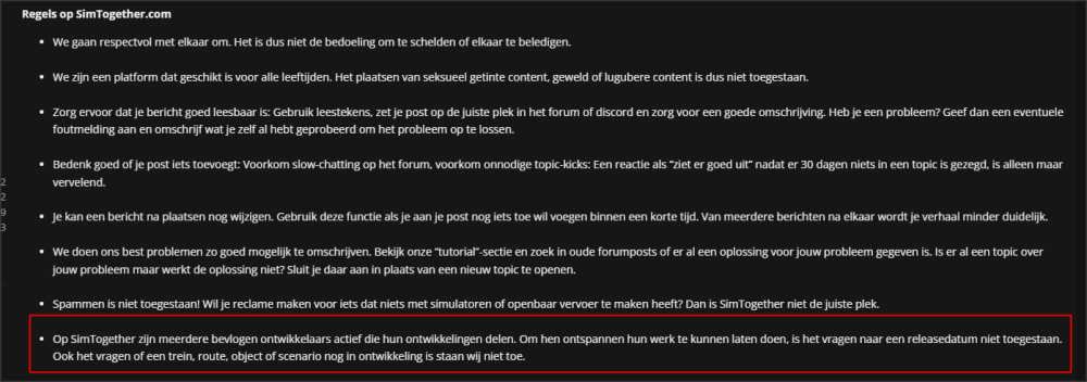 Sorry, hoor, maar ik vraag niet naar een releasedatum en ik vraag niet of deze route nog in ontwikkeling is. Ik constateer alleen maar dat een route nu al 2 jaar in Bèta-versie staat zonder dat (blijkbaar) de scenario's aangepast danwel verwijderd zijn, er niet gewaarschuwd wordt dat de aangeboden scenario's wellicht niet werken op de Bèta-versie van de route waarbij ze worden aangeboden en dat er om die redenen verwardheid kan ontstaan bij (al dan niet beginnende) gebruikers. Dan denk ik: plaats een waarschuwing, zoals "denk erom dat de route nog (steeds) in Bèta-status is, dat er derhalve misschien fouten en bugs in kunnen zitten en dat de aangeboden scenario's wellicht niet kunnen werken op deze versie". Dat zijn toch geen niet-toegestane vragen? Simtogether is een prachtige site waar ik absoluut veel bewondering voor heb en waar ik, en met mij, veel TSC-fans heel veel aan hebben (gehad). Ook voor alle leden, ontwikkelaars en ja, ook voor de moderators heb ik veel bewondering, maar waarom nu zo moeilijk doen over een simpele vraag?