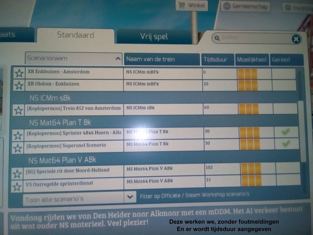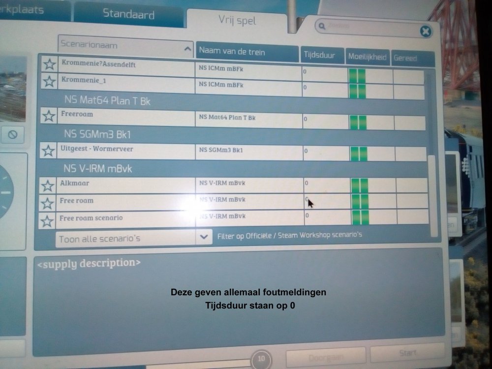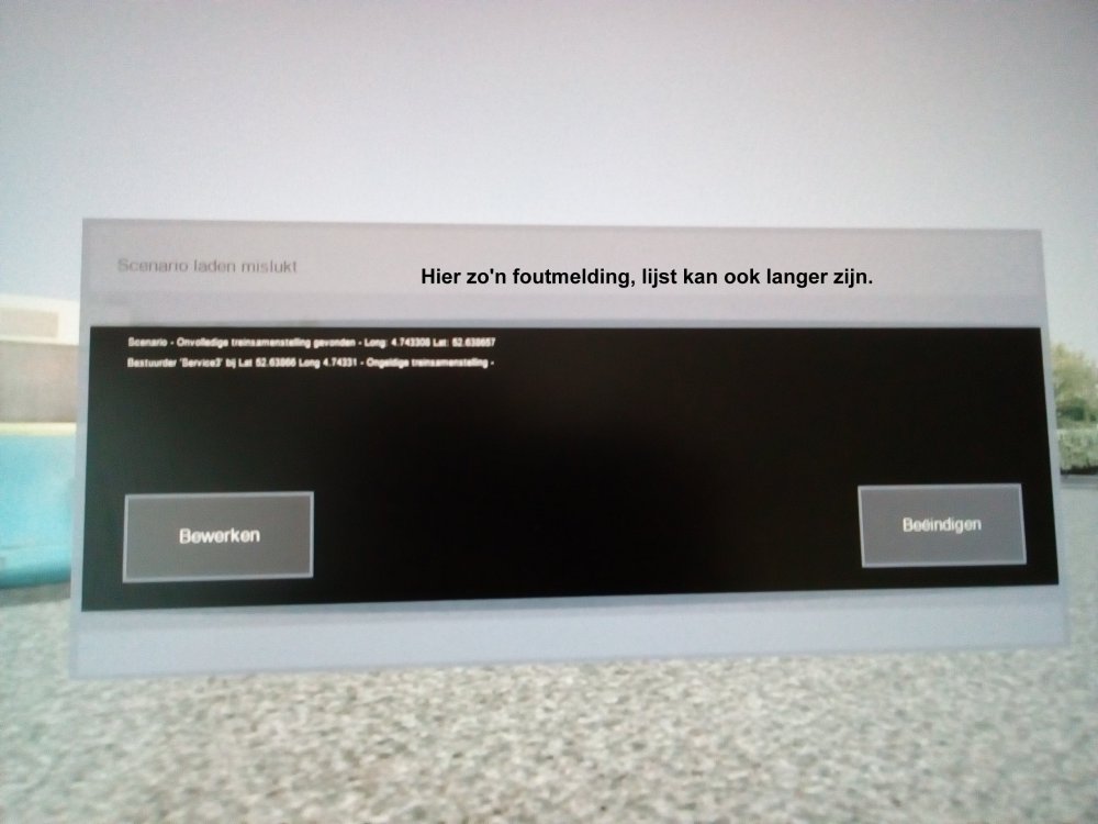 18. Hoi Sjef61, Het lijkt me beter om voorbeelden toe te sturen. Hele reeks senario's werken wel en niet in de Noordwest - Nederland 5.0. Terwijl alle benodigdheden mogelijk aanwezig zijn.! Foutmeldingen worden opgemerkt in zwart scherm met enkele zinnen. Gek genoeg doet zich dat niet voor in overige pakket; Krammersdijk Deltaland V2.1 en RCR retro canvas route & Starters Pack. WG Armseinenroute/ Coha Seinen werken niet naar behoren. Kort resumerend sommige senario's geven fouten en werken dus niet. Verder zal ik wat voorbeeld opsturen en dat neemt wat tijd in beslag tussen mijn werkzaamheden, later meer. groet Bouke.