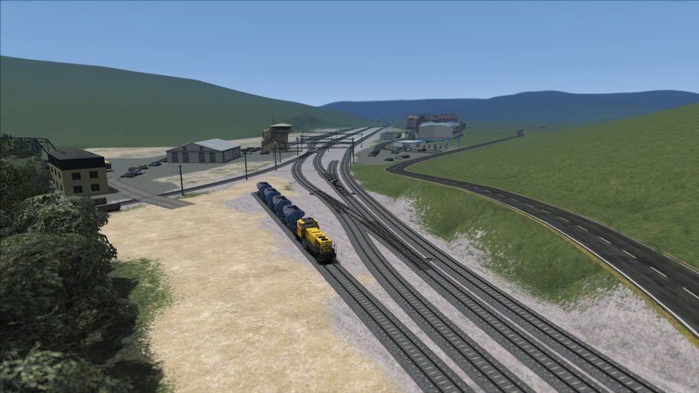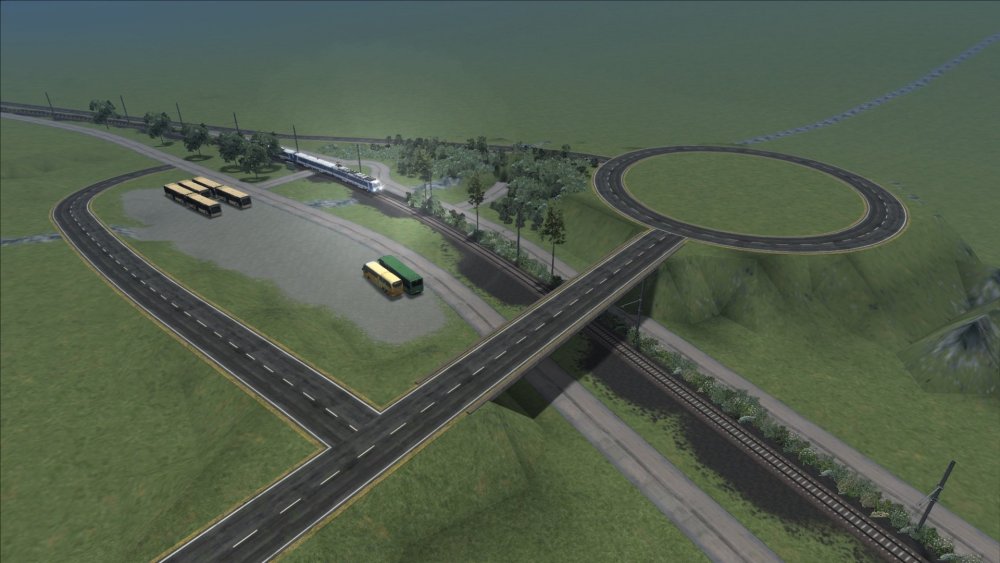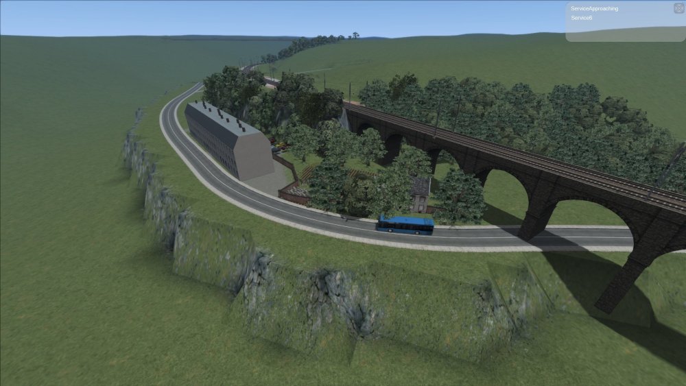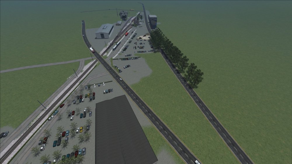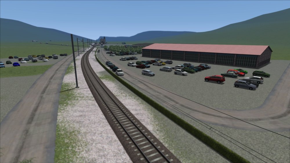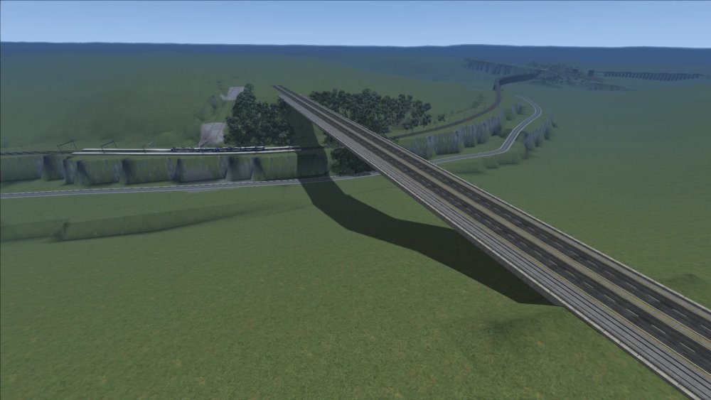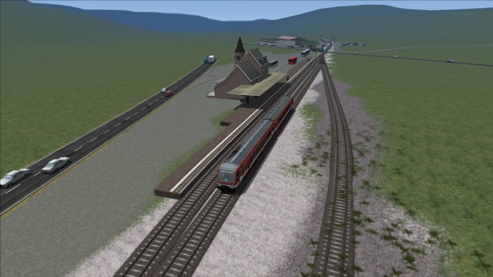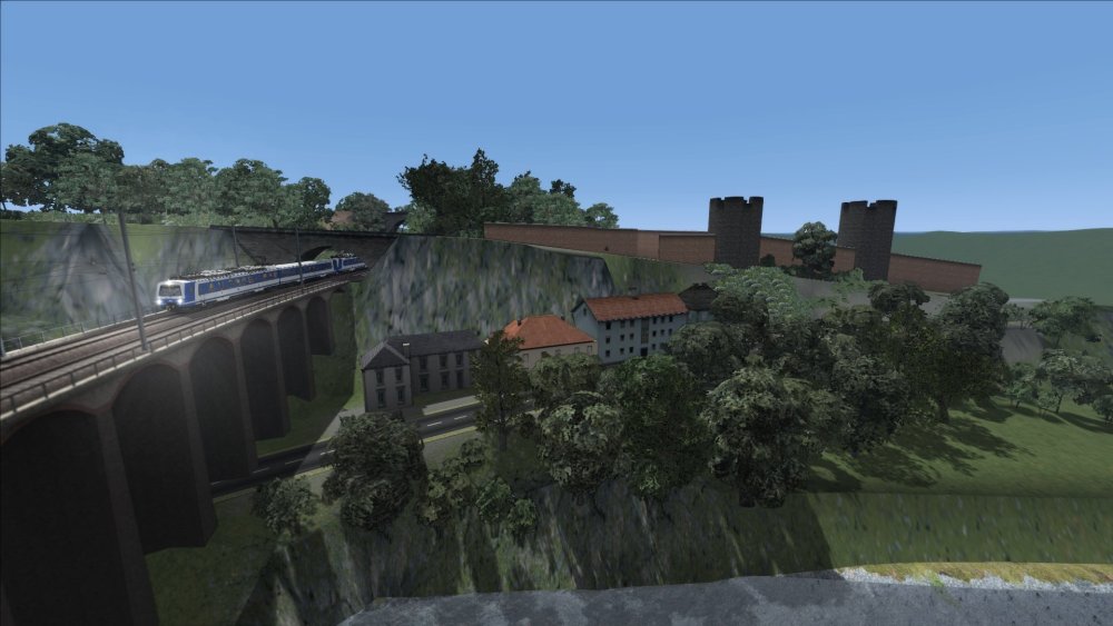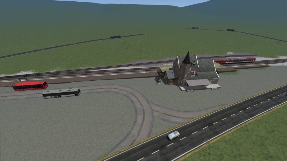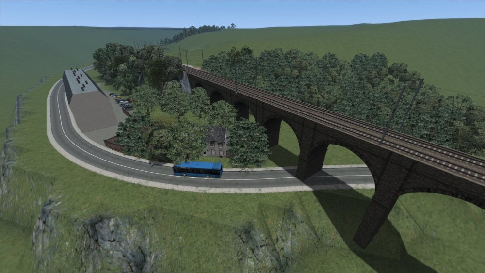 Voor dat de werkweek weer begint nog maar even lekker ontspannen gebouwd. Beetje groen op de heuvels maakt het gelijk wat aangenamer. Beetje begonnen met het dorp Alvast wat wegen gelegd richting Colmar-Berg. Nog niet perfect maar zo valt wel alvast de ruimte in te delen Viaducten moeten nog gebouwd worden. In de verte station Colmar-Berg waarvan het stationsgebouw onder het snelwegviaduct ligt. Rechts takt de goederenlijn af richting Bissen -