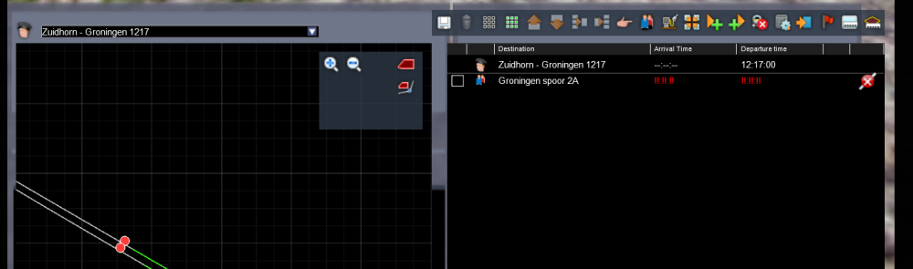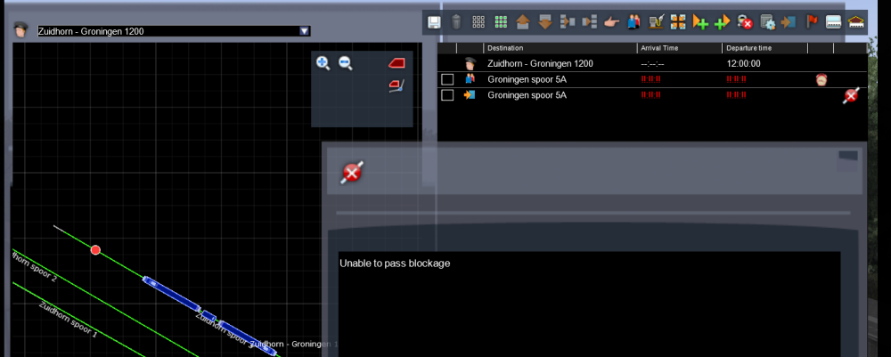 Ook krijg ik de error dat de trein naar Delfzijl zijn bestemming niet kan vinden, deze error krijg ik alleen als ik als speler het senario wil spelen. Als ik het senario gewoon laat afspelen is er geen probleem met de trein naar Delfzijl, ook geeft hij geen error in de edditor.