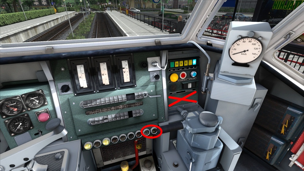Ook de Mat '57 is nu voorzien van ATB, maar helaas nog steeds niet veel info over Memor. Ik heb via MSTS het geluid van het belletje gevonden (Klinkt ongeveer hetzelfde als een ATB snelheidswijziging), maar nog steeds geen zekerheid over de lampen en de knop die je in moet drukken als je een beperkend sein passeert. Gezien andere locs met Memor en het aantal lampen dat de Mat54 op datzelfde paneel heeft, weet ik 90% zeker dat het de 2 rood omcirkelde lampen op de screen hieronder zijn, maar ik zou daar graag 100% van maken ofwel het tegendeel bevestigd krijgen. Gebeurt dat niet, fantaseer ik wat op de plek van het rode kruis. Op Memor en een handleiding na is de boel af, overigens! -