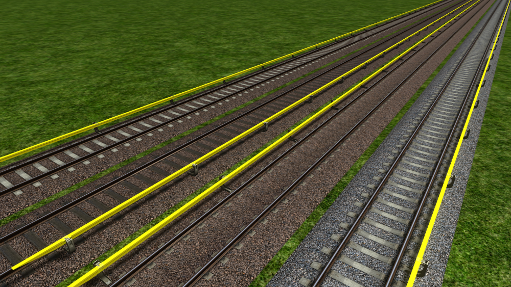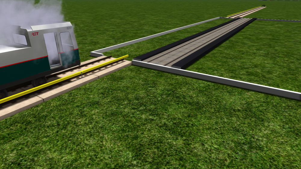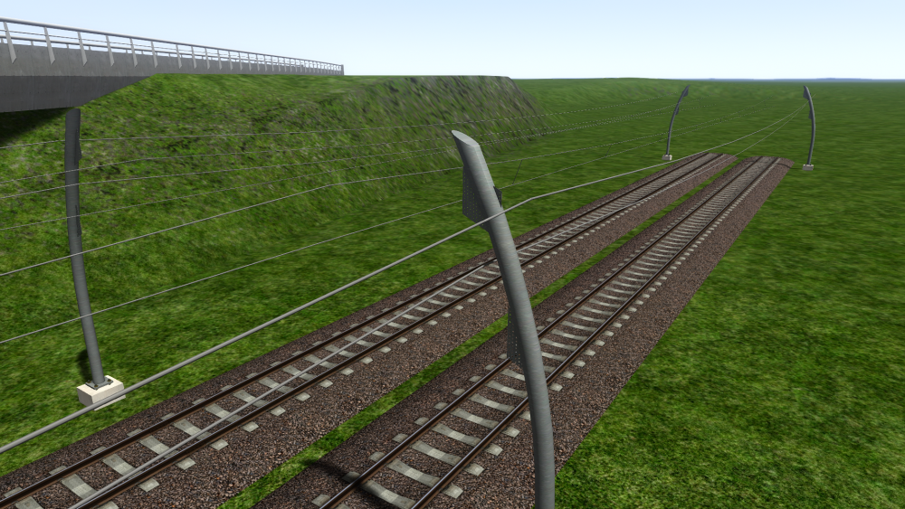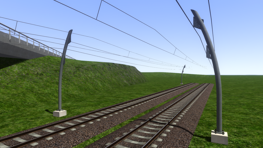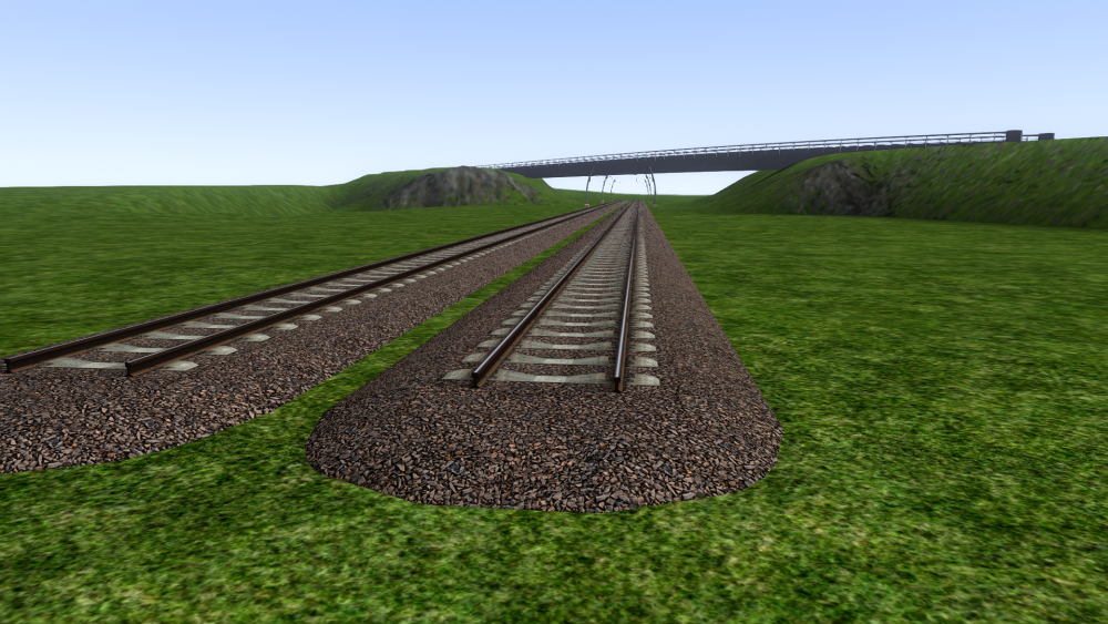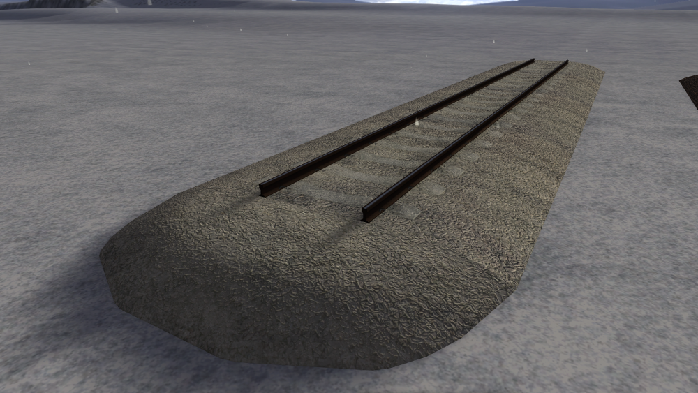 Omdat zowel de Rotterdamse metro als een ander miniproject waar ik aan werk de Betuweroute een keer kruisen, heb ik besloten maar eens een mooi pakketje spoor en bovenleiding ervoor te maken. Is verder nog in een heel pril stadium, maar open dit topic vast zodat ik om feedback kan vragen. Vinden jullie de 3d-sporen mooi, of heb ik de 3d te sterk gemaakt, of juist niet sterk genoeg? Ook zal ik hulp nodig hebben m.b.t. welke masten ik allemaal ga moeten maken, en waarvoor ze zijn, wat ik dan ook mooi hier kan doen. Alhoewel de hangers er nog niet op zitten, heeft de bovenleiding al een zigzag, welke mij iets te sterk oogt, terwijl de rijdraad toch gewoon 32cm naar links/rechts zigzagt, hetgeen met de realiteit zou moeten kloppen. Wat vinden jullie daarvan? Het spoor is net zoals in het echt iets hoger boven de grond gelegd, en de Hart-Hart afstand tussen 2 sporen is iets groter (5,5 meter i.p.v. 4,2). Ook loopt de ballast iets verder naar buiten door. Ik vind het zelf een aardig begin. Met dank aan ChrisTrains voor de ballasttextures! Op een aantal foto's die ik heb is de rijdraad grijs, dus dat heb ik voorlopig ook maar zo gedaan. Hoort dat zo? Moet de alpha's van die houdertjes nog wat aanpassen zodat de gaatjes in beide houders even groot zijn, maar het aantal gaatjes klopt in ieder geval, voor de OCD'ers onder ons. ? Wat vinden jullie van het 3d-effect? Goed? Te zwak? Te sterk? Aan mijn sneeuwtexture te zien heb ik mijn normal maps verkeerd gemaakt waardoor ze het tegenovergestelde doen van wat ze moeten doen, en de sneeuwtexture zelf vind ik persoonlijk ook iets te ijs-achtig.